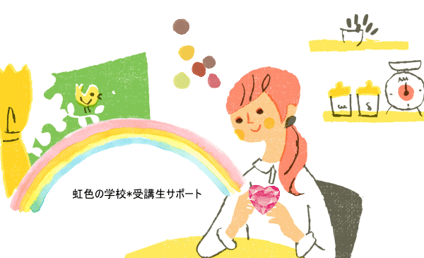虹色の学校の受講生さん全員が対象となります。授業でわかりにくかった点など、ご質問は期限なく無料です。下記の各種サポートはオンラインでご対応させていただいております。